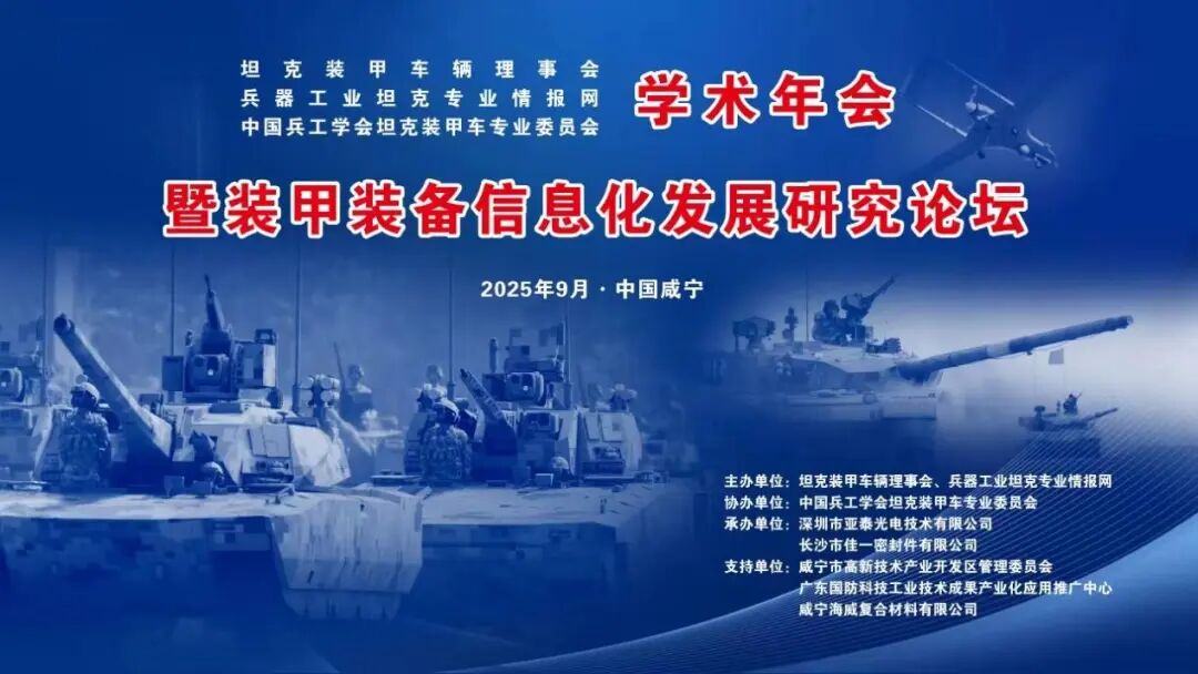 由坦克裝甲車輛理事會、兵器工業坦克專業情報網主辦,深圳市亞泰光電技術有限公司承辦的"2025年坦克裝甲車輛學術年會暨裝甲裝備信息化發展研究論壇"將于9月17日至19日在湖北咸寧華信大酒店隆重舉行。本次會議以"裝甲裝備信息化發展"為主題,旨在深入探討裝甲裝備信息化前沿技術,推動陸戰裝備智能化轉型。